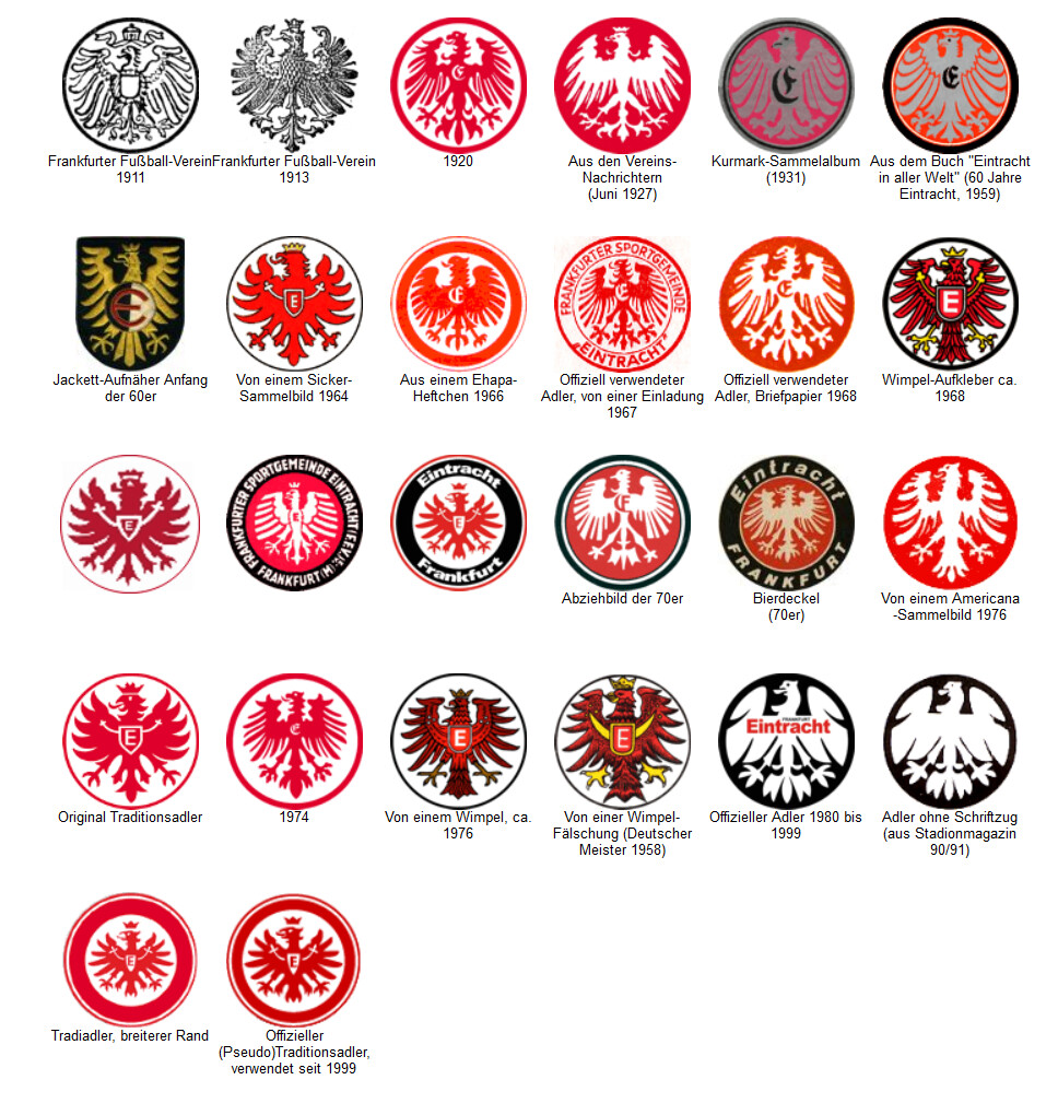 Das Vereinswappen von Eintracht Frankfurt wird von einem Adler geschmückt. Es ist angelehnt an das Frankfurter Stadtwappen. Dieses zeigt einen aufgerichteten weißen Adler mit ausgebreiteten Flügeln und gespreizten Federn und Fängen. Er streckt seine Zunge aus und auf seinem Kopf befindet sich eine Krone. Der Adler ist inspiriert von einem einköpfigen Reichsadler aus dem 13. Jahrhundert. Der Verein übernahm dieses anmutige Wappentier als Symbol. Im Laufe der Vereinsgeschichte machte der Adler nur minimale Veränderungen durch, bis dann in den “Achtziger Jahren” ein stilisierter schwarzer Adler eingeführt wurde. Anlässlich des 100-jährigen Jubiläums im Jahre 1999 entschied sich der Verein für die Wiedereinführung des traditionellen Adlers als Wappentier.